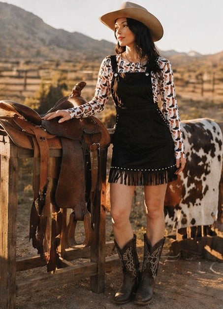 BLACK SUEDE STUDDED OVERALL DRESS W FRINGE HEM