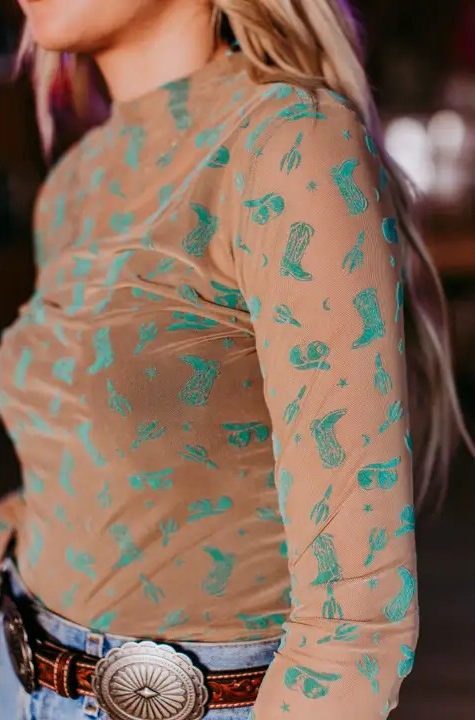 All About Country Mesh Long Sleeve Top This lightweight trendy mesh is a hit. This long sleeve turquoise and tan mesh features a comfortable fit and a high neckline. It gives a country western feel with its boots, hat, and cactus 3D print.