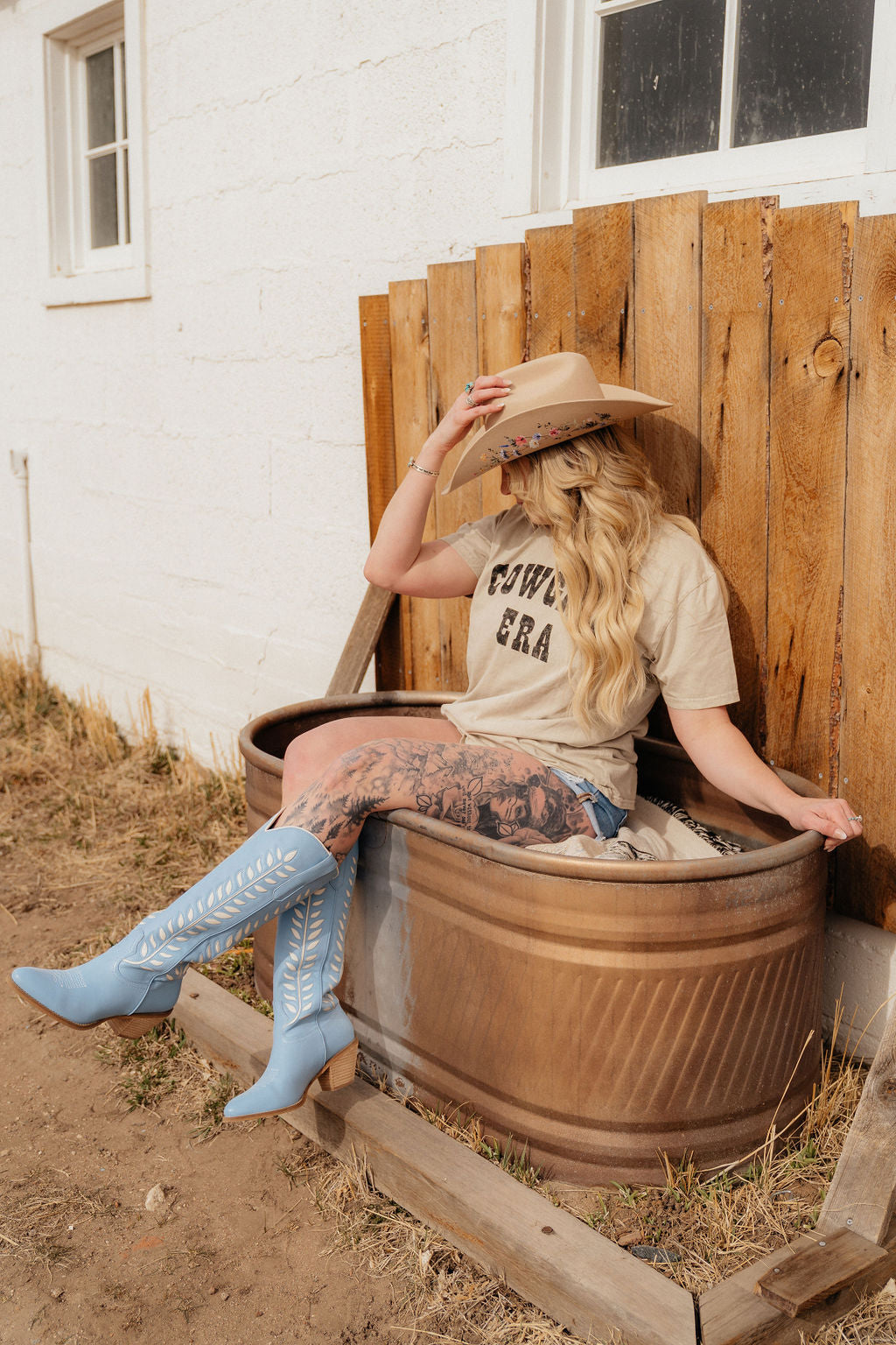 Get ready to turn heads with The Mickey Boots! These gorgeous blue cowboy boots feature intricate white stitch detailing, adding a touch of Western charm to any outfit. Step in style and comfort with these boots that are sure to make a statement. Yeehaw!