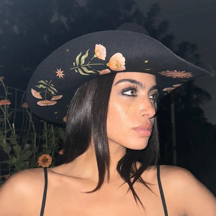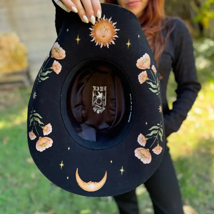 The Stevie Western features art made by artist Leni Lupin. All artwork on Wild As Heck hats is handmade by various artists. Each hat is handmade to order. The application method is a proprietary method that took Wild As Heck over 2 years to develop. The images are not hand painted, but hand applied with our method. All artwork is waterproof and will not smudge.